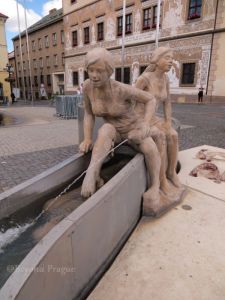 The fountain is named for the Jizera river that runs through the city and it includes a metal trough for water to run through and represent the river as well as statues of young people having fun and enjoying the river.