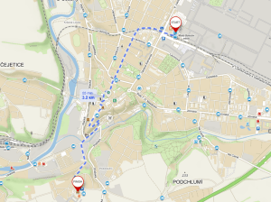Following Štyrsova will take you through a residential area and light industrial area before it joins with Nádražní street. once you reach Nádražní street, you will clearly be able to see the city castle on your right. From there you can walk to the controlled junction of Nádražní and Ptácká streets, directly below the castle.