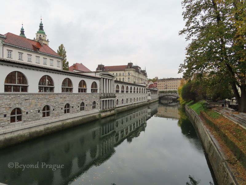 Viewing the Ljubljanica river enbankments and Triple Bridge, both the work of Jože Plečnik.