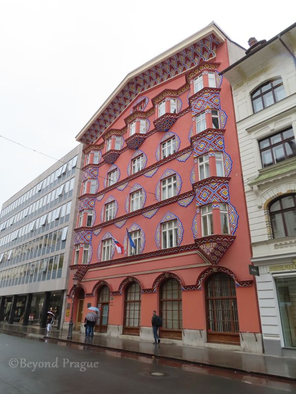 Another highlight of Ljubljana’s Secessionist style is the Cooperative Business Bank, designed by Plečnik’s contemporary Ivan Vurnik (1884–1971). While Plečnik adhered strictly to the style’s principles, Vurnik experimented more, blending Secessionist form with Slovenian folk motifs. Together with his wife, Helena (1882–1962), he designed the bank building in 1921. Its façade, painted in Slovenia’s national colours and patterned with folk-inspired designs, makes it one of the city’s most striking landmarks.