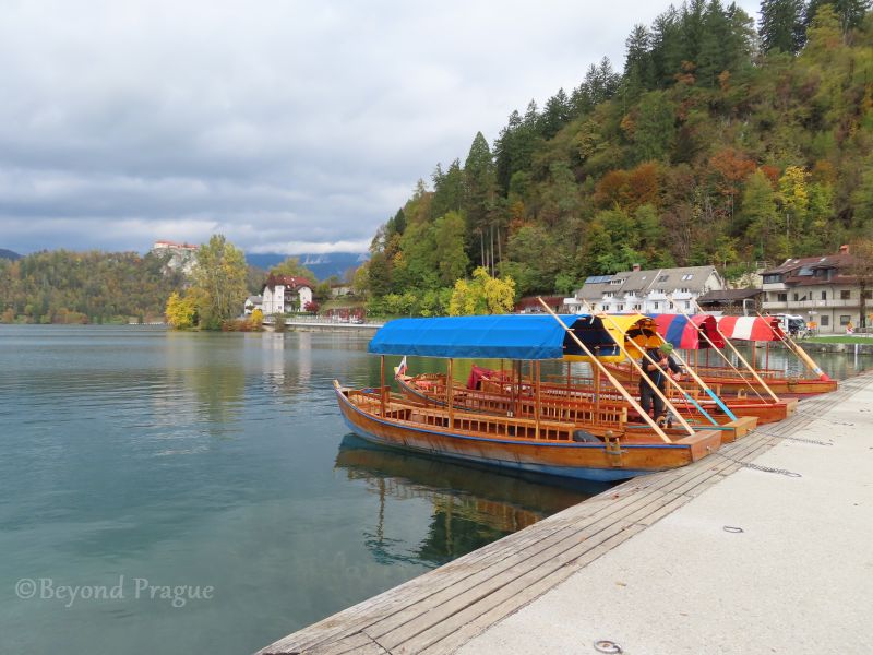 Distinctive pletna boats waiting to ferry tourists across the lake to Bled Island.