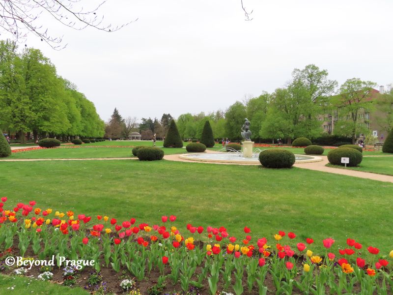 Looking across T. G. Masaryk Square to Lázeňský Park and Libenský Colonnade